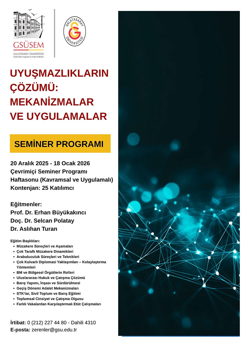 Eğitim yeri: Online (Teams üzerinden) + son seans ders - Galatasaray Üniversitesi Ortaköy yerleşkesi (katılabilenlerle ve çevrimiçi)